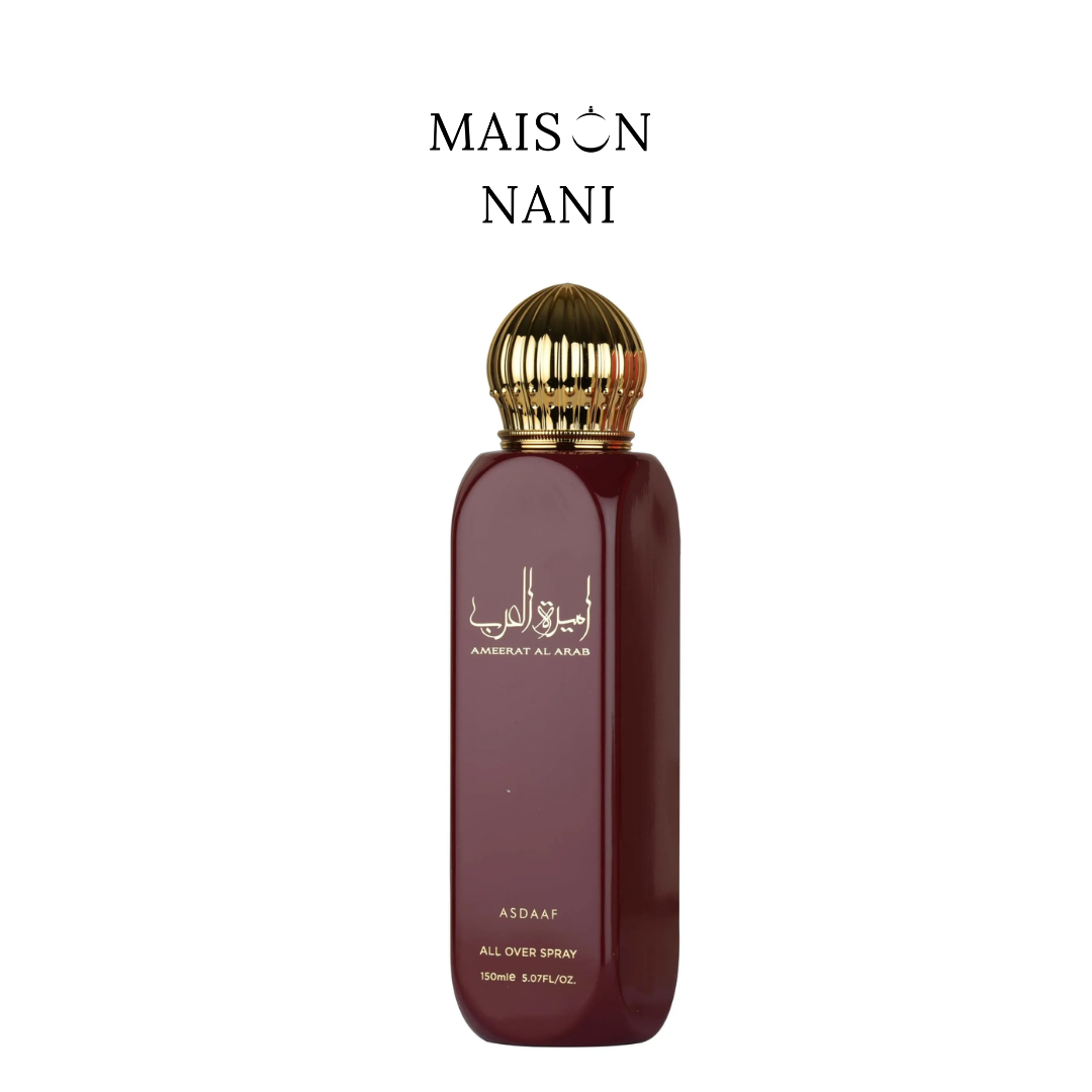 Ameerat Al Arab All Over Spray es una bruma corporal y capilar femenina con un perfil aromático, floral y especiado. Su salida combina albahaca, cardamomo y menta, aportando una sensación fresca y vibrante. En el corazón aparecen madreselva y lavanda, que suavizan la composición con un matiz floral elegante. En el fondo, azafrán, pimienta y jazmín dejan una estela cálida, sofisticada y con carácter.