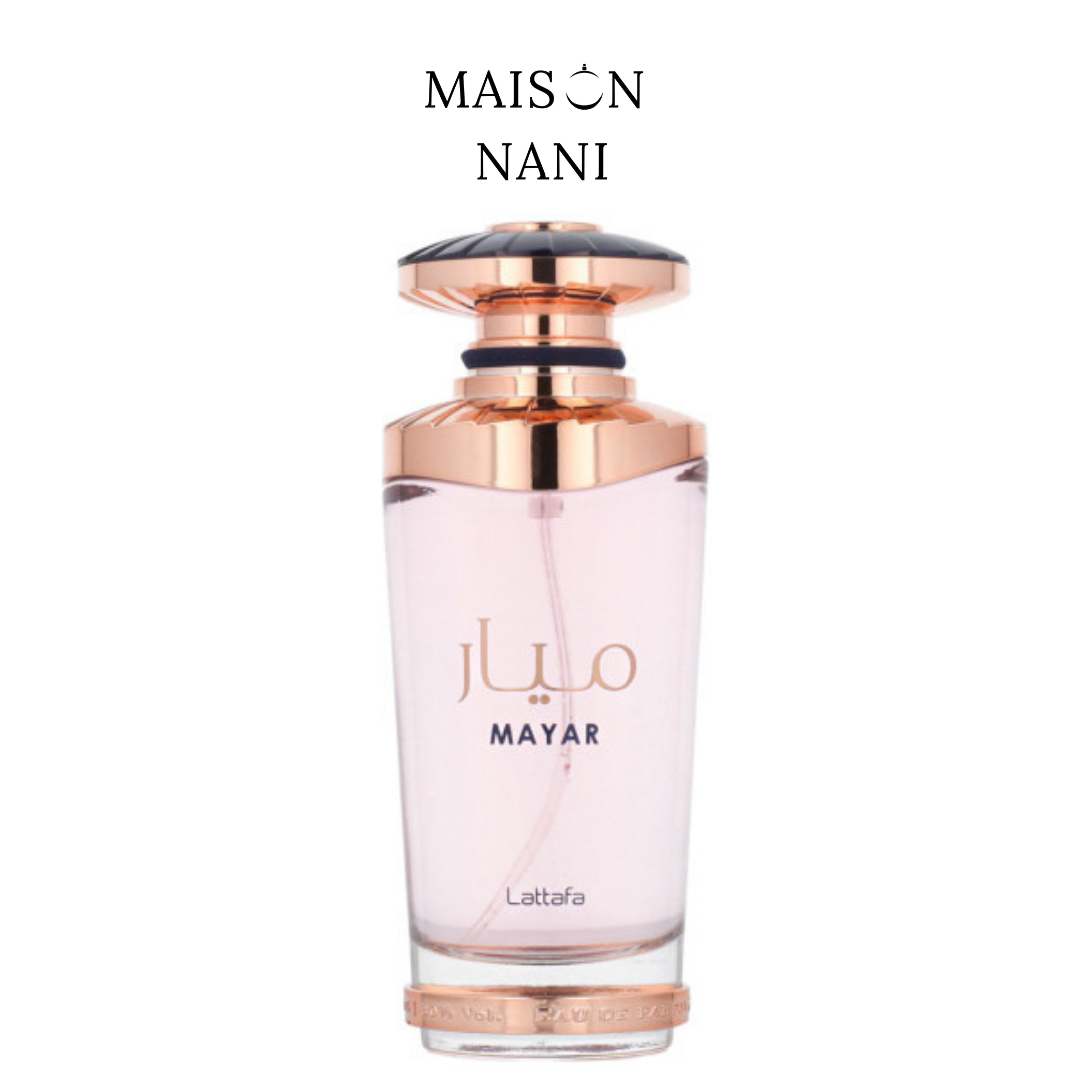 Mayar de Lattafa es una fragancia femenina floral frutal elegante y versátil, diseñada para destacar la feminidad con un aroma dulce, radiante y moderno. Combina frutas jugosas con flores suaves y una base cálida y sensual, creando un perfume atractivo, fresco y fácil de llevar.